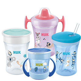 We offer learner cups and bottles in many different sizes and shapes, so there's a model to suit everyone. With a spout or a 360-degree drinking rim, our NUK learner cups and bottles make everyday life easier for parents and help your child to develop new skills. You can easily determine the level of support your child needs when drinking from a NUK cup: The ergonomic handles of the learner cups are a useful detail, especially in the early days, to introduce your baby to drinking from cups at the appropriate pace. If your child can already manage without stabilisers, you can try drinking from handleless learner cups with a drinking straw.
