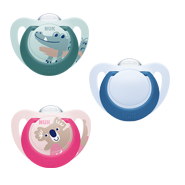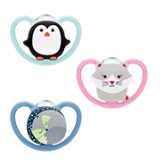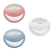 All NUK soothers have the orthodontically correct NUK shape and an anatomically shaped mouth plate made of high-quality plastic. Our soothers also feature the Air System, which means that air can escape from the teat through a valve. This keeps it soft and sufficiently flat to prevent jaw deformations. A further advantage of the NUK soother is the NUK size concept: We offer you and your baby the right soother size for every age group and every type of food. This is because soothers and teats should adapt optimally to the oral cavity and thus to your child's natural jaw development at every stage of early life. With natural products or special plastics, the NUK soothers are soft and adapt to the child's palate. At the same time, they score points with many different, cute and colourful motifs, making them a loyal companion on your beloved child's exciting discovery tours.